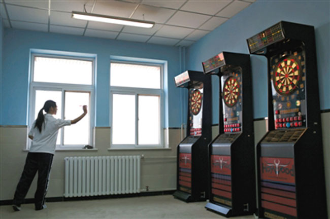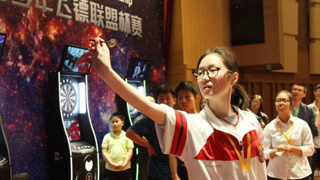 訓練場上,57中一名女生右腿略彎支撐身體,橫向站立,側身、瞄準、擲鏢,投中,順暢地完成了這一系列動作。接著第二次,第三次…… 在這間教室內,7,8臺電子飛鏢機,每個鏢靶都已經插滿了針眼,可想訓練之艱苦。這門選修一直吸引了很多學生參加,但是只有基礎的學生,練習成績過關的學生,才能成為學校運動隊一員,代表學校參加比賽。或許不久將來,在國內外飛鏢比賽賽場上,會更多一些天賦爆棚的新生代選手。