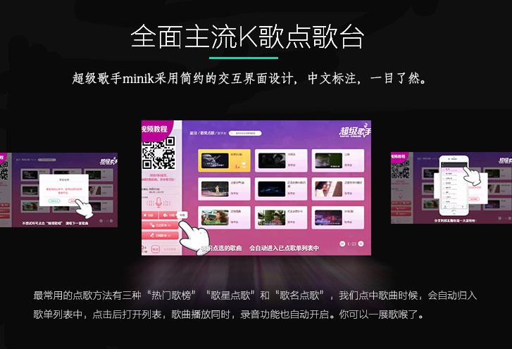 老少皆宜的觸屏式操作點(diǎn)歌界面、歌星、分類等點(diǎn)歌方式一觸即達(dá)帶來(lái)非凡的視覺易用體驗(yàn)。